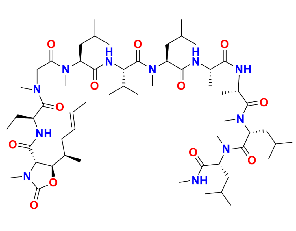 | Chemical name | (4S, 5R)-5-((R, E)-hex-4-en-2-yl)-3-methyl-2-oxo-N-((4S, 7S, 10R, 13S, 16S, 19S, 22S, 28S)-4, 7, 16, 22-tetraisobutyl-19-isopropyl-5, 8, 10, 13, 17, 23, 26-heptamethyl-3, 6, 9, 12, 15, 18, 21, 24, 27-nonaoxo-2, 5, 8, 11, 14, 17, 20, 23, 26-nonaazatriacontan-28-yl)oxazolidine-4-carboxamide |