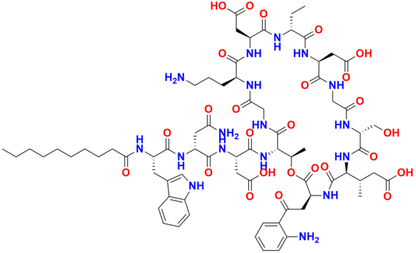 | Chemical name | 2, 2'-((3S, 6S, 9R, 15S, 18R, 21S, 24S, 30S, 31R)-30-((S)-2-((R)-4-Amino-2-((S)-2-decanamido-3-(1H-indol-3-yl)propanamido)-4-oxobutanamido)-3-carboxypropanamido)-3-(2-(2-aminophenyl)-2-oxoethyl)-24-(3-aminopropyl)-6-((S)-1-carboxypropan-2-yl)-18-ethyl-9-(hydroxyme |