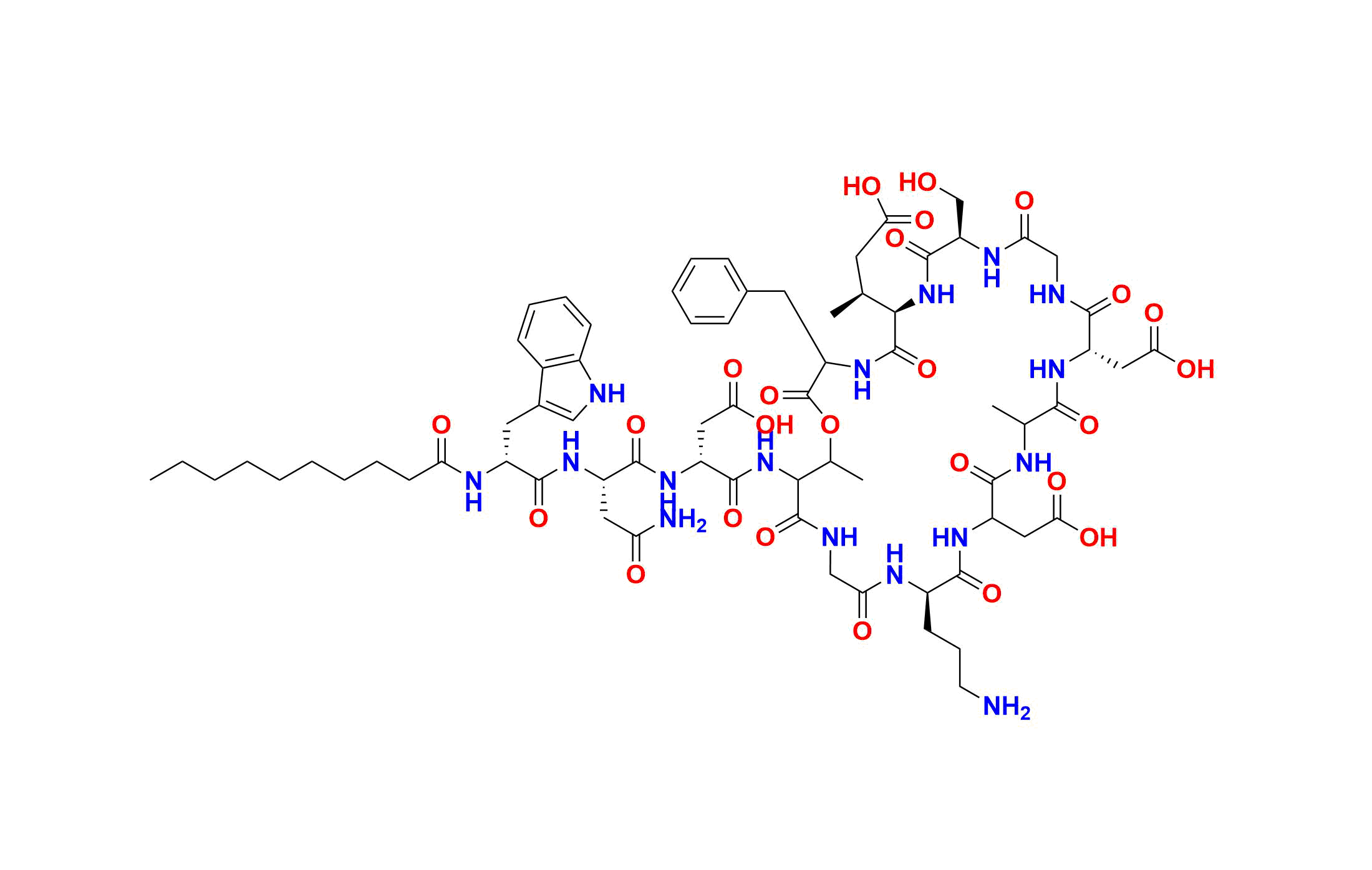| Chemical name | 2,2'-((6R,9R,15S,24R)-30-((R)-2-((S)-4-amino-2-((R)-2-decanamido-3-(1H-indol-3-yl)propanamido)-4-oxobutanamido)-3-carboxypropanamido)-24-(3-aminopropyl)-3-benzyl-6-((S)-1-carboxypropan-2-yl)-9-(hydroxymethyl)-18,31-dimethyl-2,5,8,11,14,17,20,23,26,29-decaoxo-1-oxa-4,7,10,13,16,19,22,25,28-nonaazacyclohentriacontane-15,21-diyl)diacetic acid |