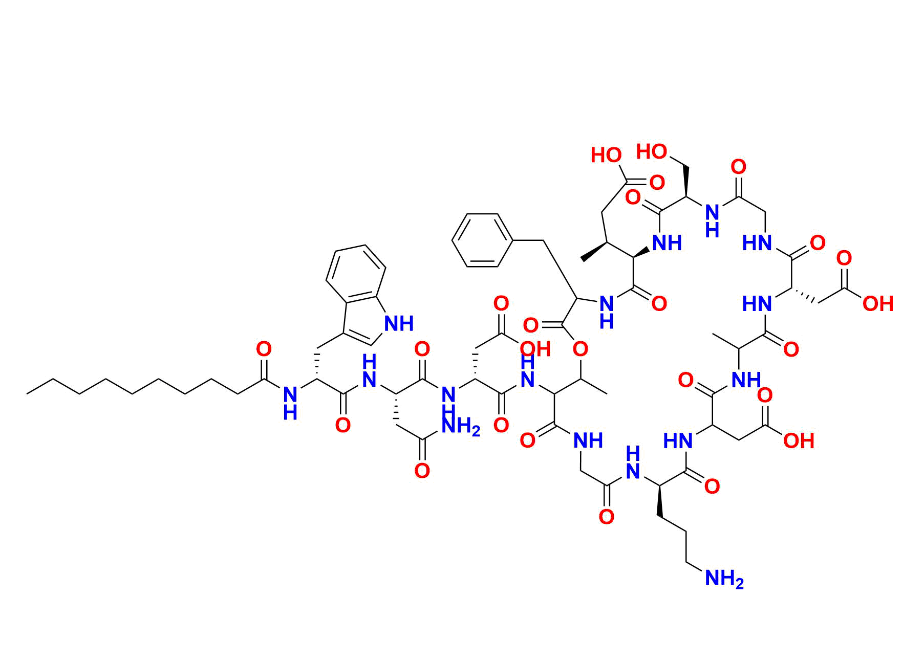 | Chemical name | 2,2'-((6R,9R,15S,24R)-30-((R)-2-((S)-4-amino-2-((R)-2-decanamido-3-(1H-indol-3-yl)propanamido)-4-oxobutanamido)-3-carboxypropanamido)-24-(3-aminopropyl)-3-benzyl-6-((S)-1-carboxypropan-2-yl)-9-(hydroxymethyl)-18,31-dimethyl-2,5,8,11,14,17,20,23,26,29-decaoxo-1-oxa-4,7,10,13,16,19,22,25,28-nonaazacyclohentriacontane-15,21-diyl)diacetic acid |