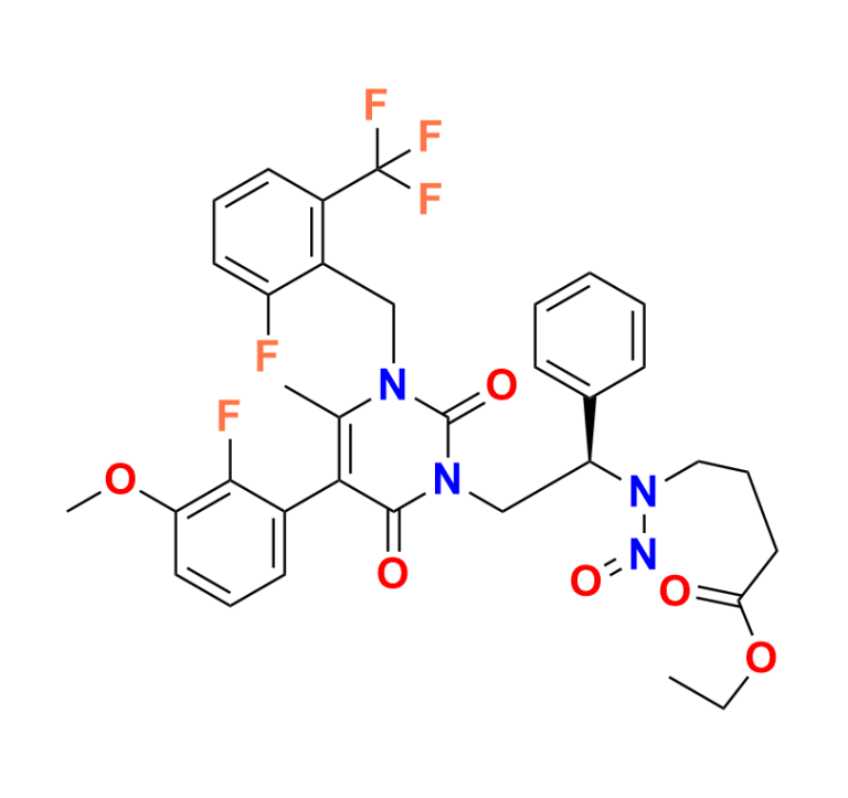 | Chemical Name | (R)-ethyl 4-((2-(5-(2-fluoro-3-methoxyphenyl)-3-(2-fluoro-6-(trifluoromethyl)benzyl)-4-methyl-2,6-dioxo-2,3-dihydropyrimidin-1(6H)-yl)-1-phenylethyl)(nitroso)amino)butanoate |