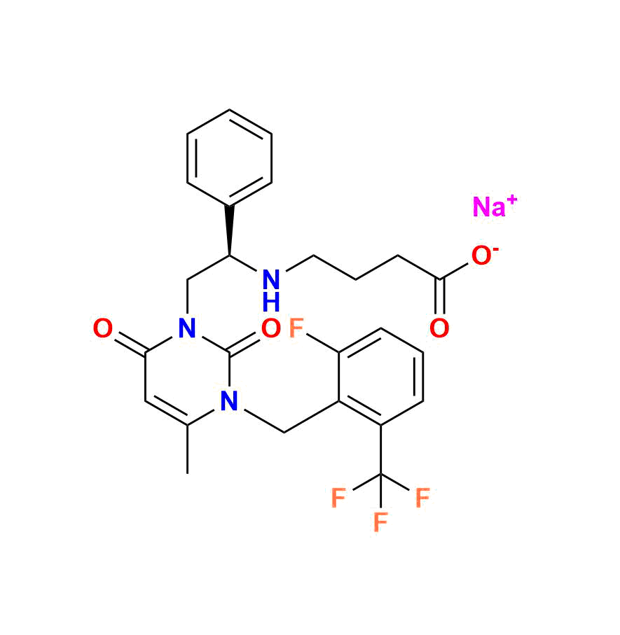 | Chemical name | sodium (R)-4-((2-(3-(2-fluoro-6-(trifluoromethyl)benzyl)-4-methyl-2, 6-dioxo-3, 6-dihydropyrimidin-1(2H)-yl)-1-phenylethyl)amino)butanoate |