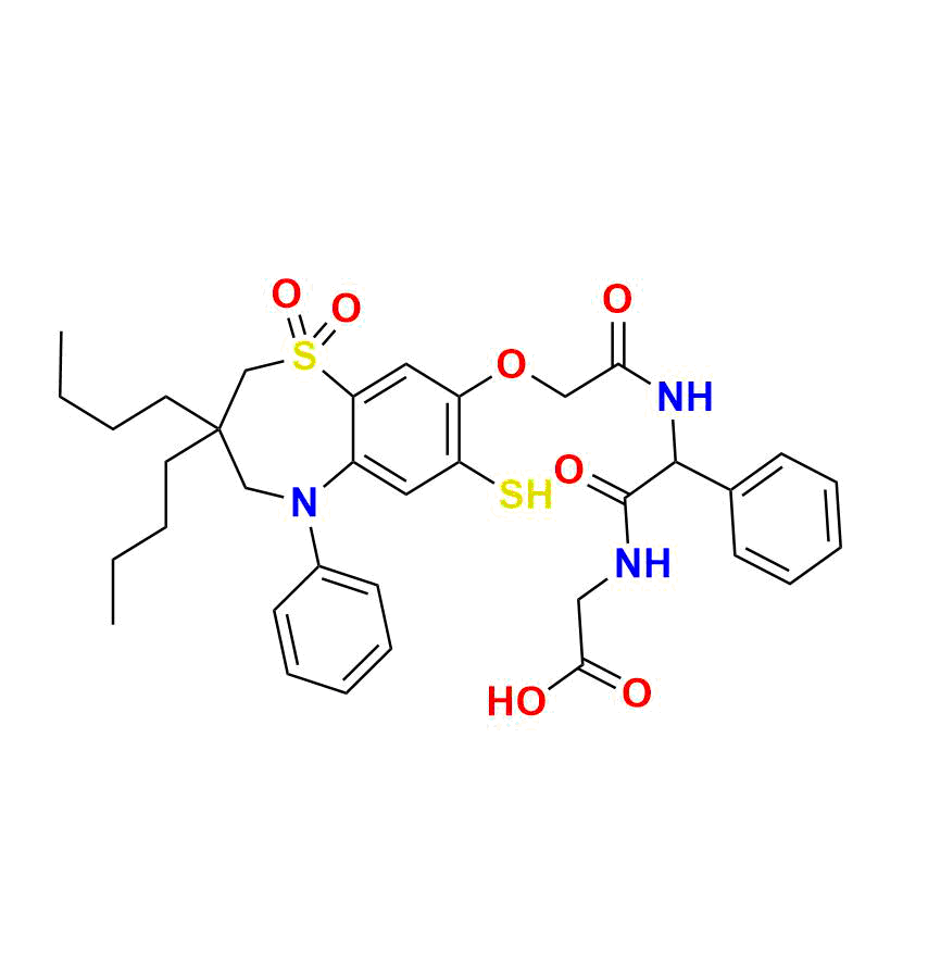| Chemical name | (2-(2-((3, 3-dibutyl-7-mercapto-1, 1-dioxido-5-phenyl-2, 3, 4, 5-tetrahydrobenzo[b][1, 4]thiazepin-8-yl)oxy)acetamido)-2-phenylacetyl)glycine |