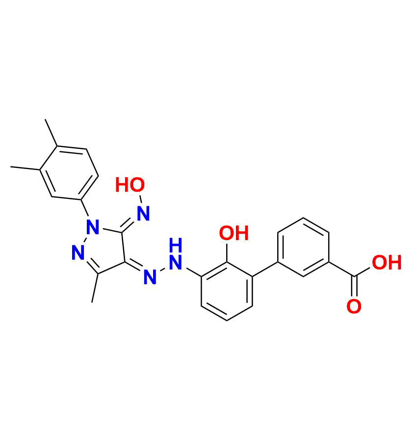 | Chemical name | 3'-(2-((4Z, 5Z)-1-(3, 4-dimethylphenyl)-5-(hydroxyimino)-3-methyl-1, 5-dihydro-4H-pyrazol-4-ylidene)hydrazineyl)-2'-hydroxy-[1, 1'-biphenyl]-3-carboxylic acid |