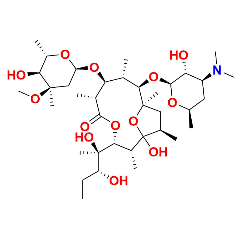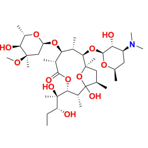| Chemical name | (2R, 3R, 6R, 7S, 8S, 9R, 10R, 12R)-3-((2R, 3R)-2, 3-dihydroxypentan-2-yl)-9-(((2S, 3R, 4S, 6R)-4-(dimethylamino)-3-hydroxy-6-methyltetrahydro-2H-pyran-2-yl)oxy)-1-hydroxy-7-(((2R, 4R, 5S, 6S)-5-hydroxy-4-methoxy-4, 6-dimethyltetrahydro-2H-pyran-2-yl)oxy)-2, 6, 8, 10, 12-pentamethyl-4, 13-dioxabicyclo[8.2.1]tridecan-5-one |