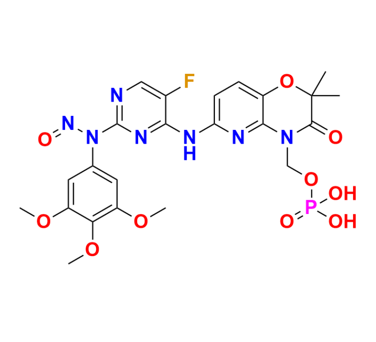 | Chemical Name | (6-((5-fluoro-2-(nitroso(3,4,5-trimethoxyphenyl)amino)pyrimidin-4-yl)amino)-2,2-dimethyl-3-oxo-2H-pyrido[3,2-b][1,4]oxazin-4(3H)-yl)methyl dihydrogen phosphate |