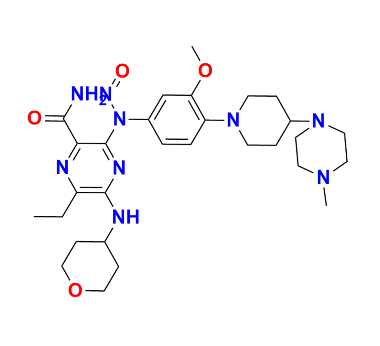 | Chemical Name | 6-ethyl-3-((3-methoxy-4-(4-(4-methylpiperazin-1-yl)piperidin-1-yl)phenyl)(nitroso)amino)-5-((tetrahydro-2H-pyran-4-yl)amino)pyrazine-2-carboxamide |