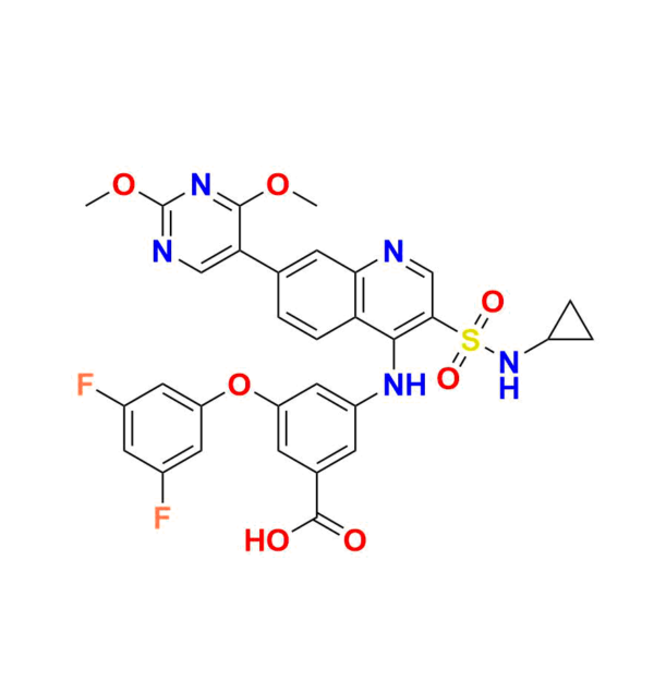 | Chemical name | 3-((3-(N-cyclopropylsulfamoyl)-7-(2, 4-dimethoxypyrimidin-5-yl)quinolin-4-yl)amino)-5-(3, 5-difluorophenoxy)benzoic acid |