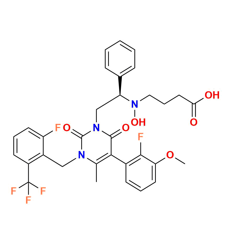 | Chemical name | (R)-4-((2-(5-(2-fluoro-3-methoxyphenyl)-3-(2-fluoro-6-(trifluoromethyl)benzyl)-4-methyl-2, 6-dioxo-3, 6-dihydropyrimidin-1(2H)-yl)-1-phenylethyl)(hydroxy)amino)butanoic acid |