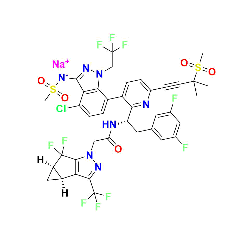 | Chemical name | sodium (4-chloro-7-(2-((S)-1-(2-((3bS,4aR)-5,5-difluoro-3-(trifluoromethyl)-3b,4,4a,5-tetrahydro-1H-cyclopropa[3,4]cyclopenta[1,2-c]pyrazol-1-yl)acetamido)-2-(3,5-difluorophenyl)ethyl)-6-(3-methyl-3-(methylsulfonyl)but-1-yn-1-yl)pyridin-3-yl)-1-(2,2,2-trifluoroethyl)-1H-indazol-3-yl)(methylsulfonyl)amide |