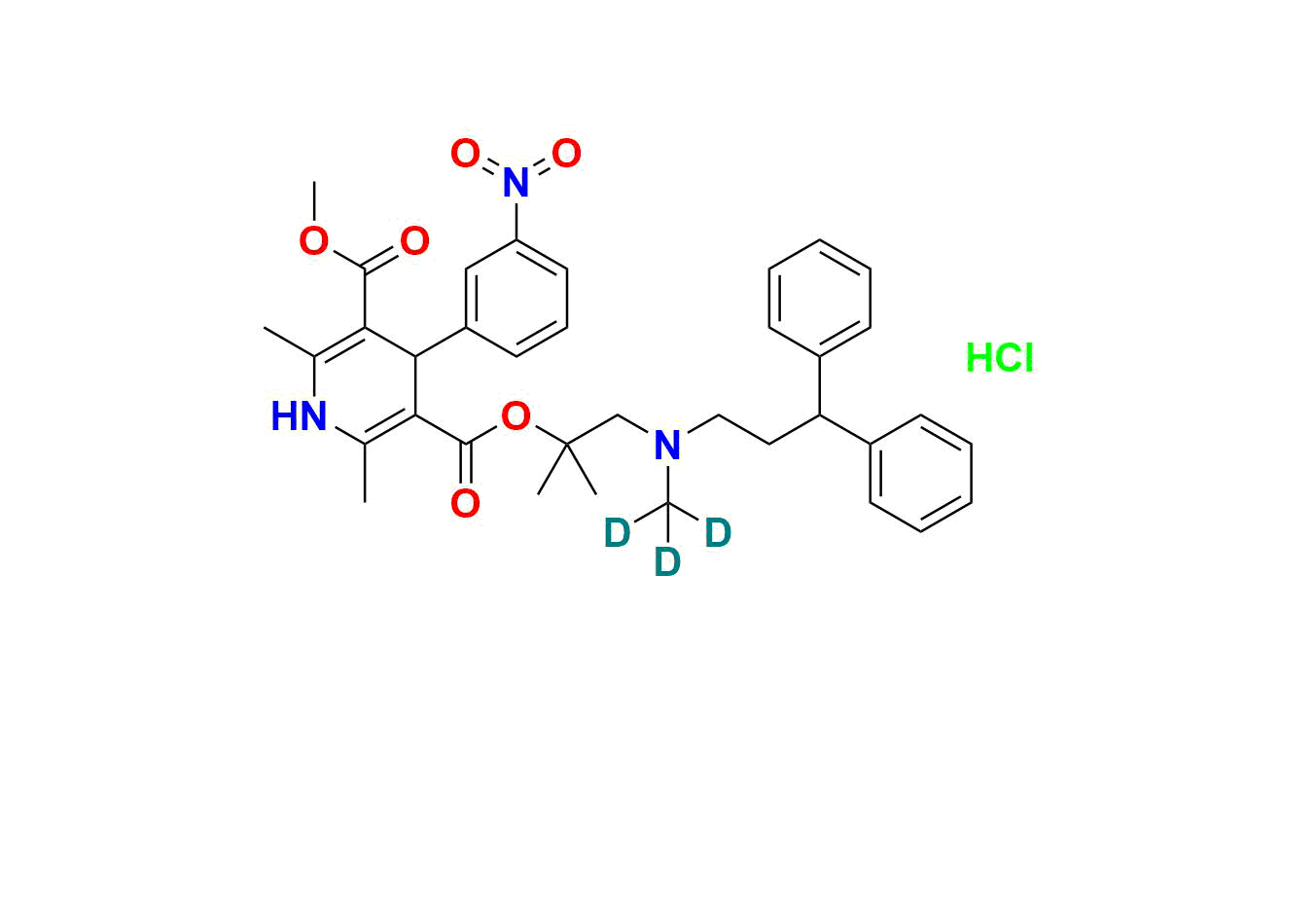 | Chemical name | 3-(1-((3, 3-diphenylpropyl)(methyl-d3)amino)-2-methylpropan-2-yl) 5-methyl 2, 6-dimethyl-4-(3-nitrophenyl)-1, 4-dihydropyridine-3, 5-dicarboxylate hydrochloride |