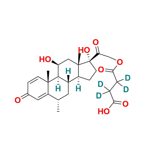 Methylprednisolone 21-Hemisuccinate D4 can be used as a reference standard, with possible traceability to pharmacopeial standards such as USP or EP, based on feasibility. AquigenBio products are strictly for analytical purposes and is not intended for human use.