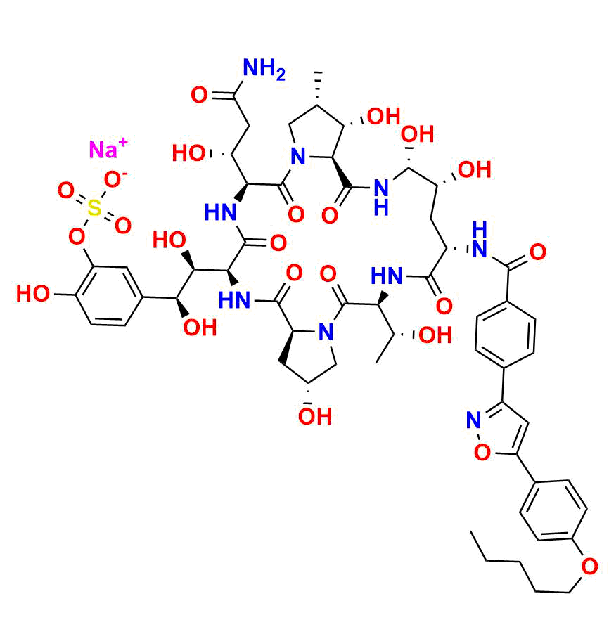| Chemical name | sodium 5-((1S,2S)-2-((2R,6S,9S,11R,12R,14aS,15S,16S,20S,23S,25aS)-20-((R)-3-amino-1-hydroxy-3-oxopropyl)-2,11,12,15-tetrahydroxy-6-((R)-1-hydroxyethyl)-16-methyl-5,8,14,19,22,25-hexaoxo-9-(4-(5-(4-(pentyloxy)phenyl)isoxazol-3-yl)benzamido)tetracosahydro-1H-dipyrrolo[2,1-c:2',1'-l][1,4,7,10,13,16]hexaazacyclohenicosin-23-yl)-1,2-dihydroxyethyl)-2-hydroxyphenyl sulfate |