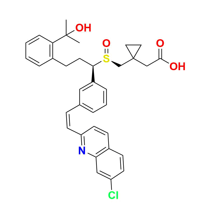 | Chemical name | 2-(1-(((S)-((R)-1-(3-((Z)-2-(7-chloroquinolin-2-yl)vinyl)phenyl)-3-(2-(2-hydroxypropan-2-yl)phenyl)propyl)sulfinyl)methyl)cyclopropyl)acetic acid |