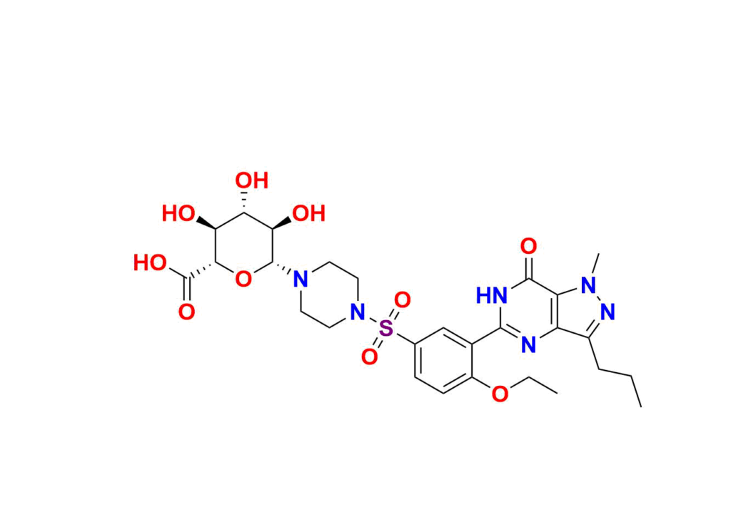 N-Desmethyl Sildenafil N-Glucuronide can be used as a reference standard, with possible traceability to pharmacopeial standards such as USP or EP, based on feasibility. AquigenBio products are strictly for analytical purposes and is not intended for human use.