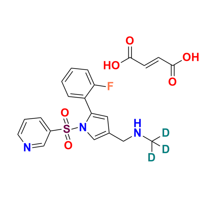 Vonoprazan-D3 Fumarate is a high-quality reference standard supplied with comprehensive characterization data, ensuring compliance with regulatory guidelines. This product is essential for analytical method development, method validation (AMV), quality control (QC) applications, and plays a crucial role in Abbreviated New Drug Applications (ANDA).