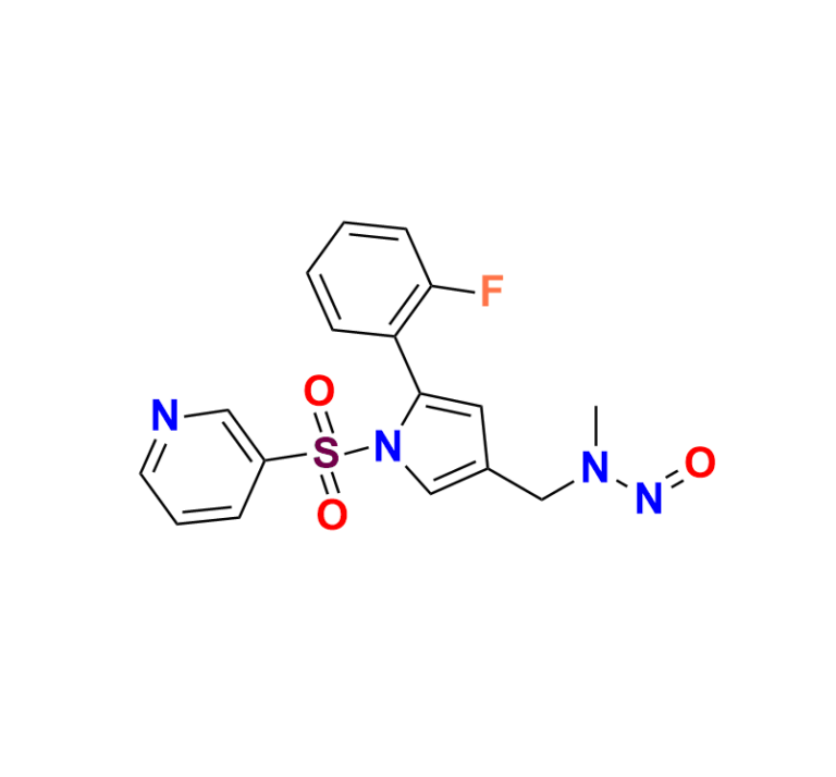 Vonoprazan Nitroso Impurity is a high-quality reference standard supplied with comprehensive characterization data, ensuring compliance with regulatory guidelines. This product is essential for analytical method development, method validation (AMV), quality control (QC) applications, and plays a crucial role in Abbreviated New Drug Applications (ANDA).